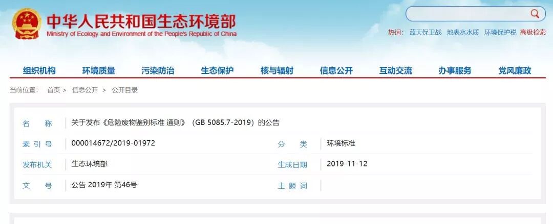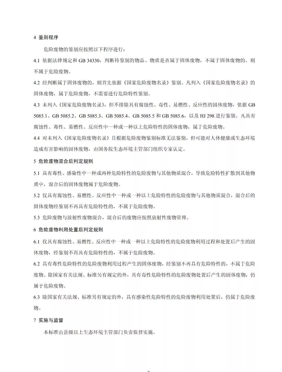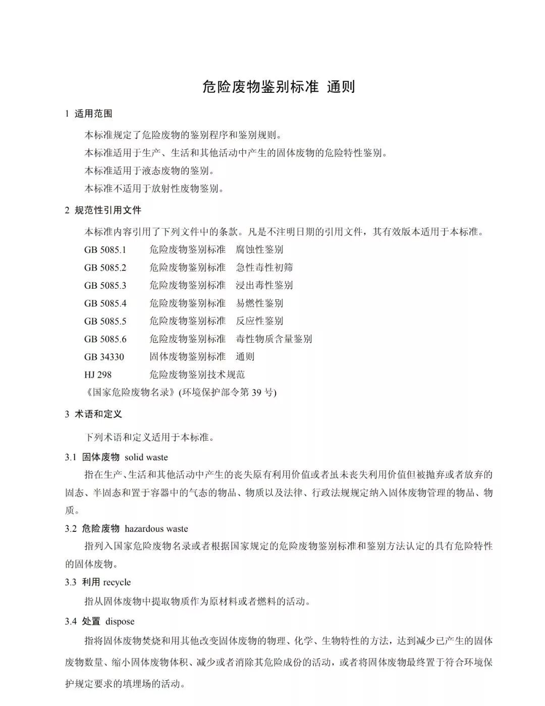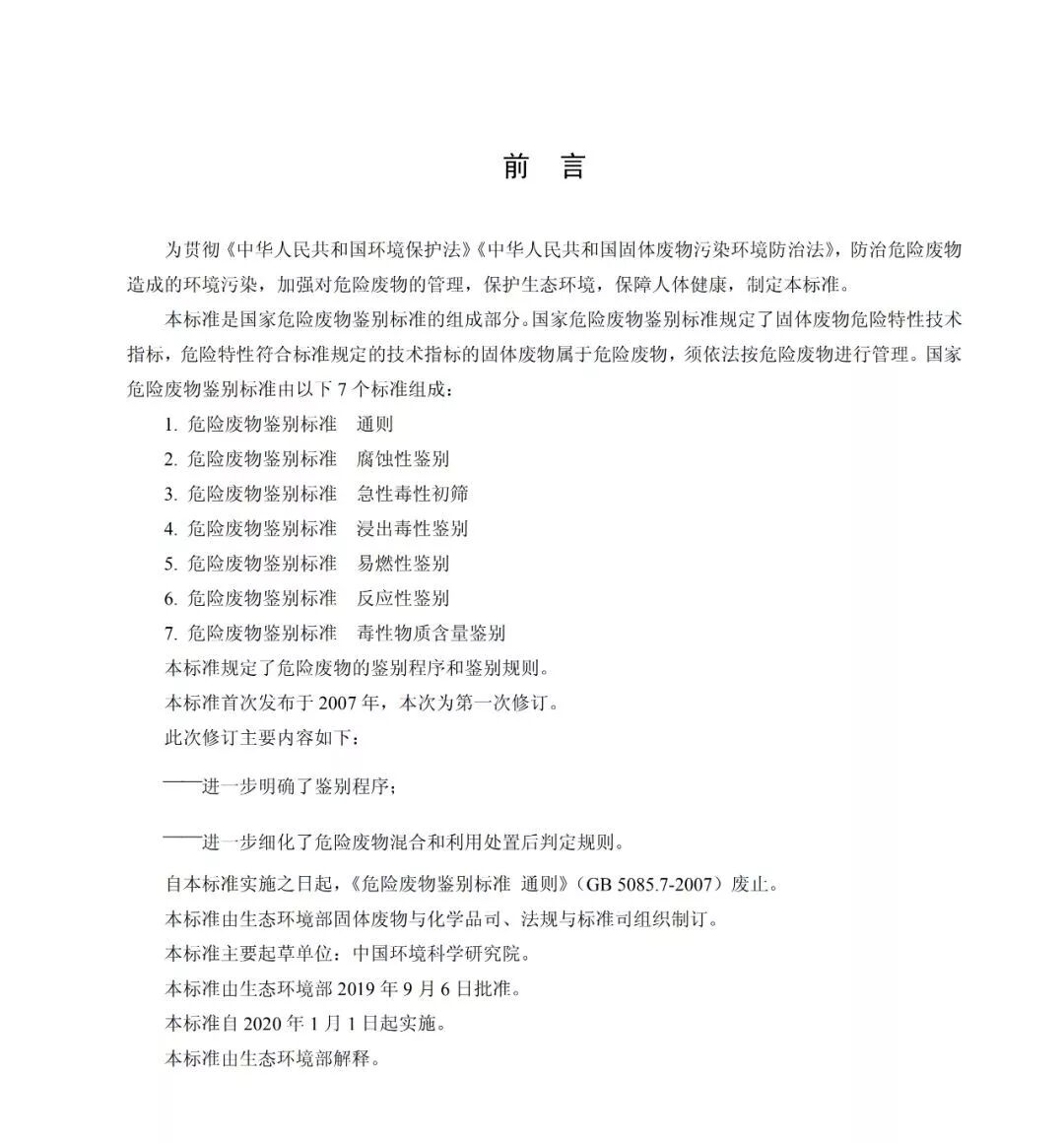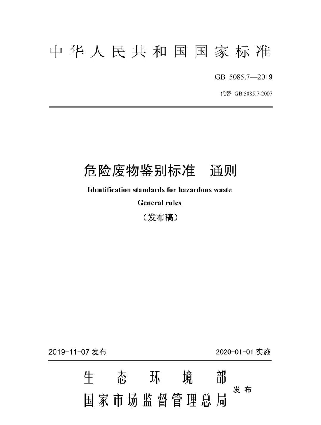 以上标准自2020年1月1日起实施,自实施之日起,《危险废物鉴别标准 通则》(GB 5085.7-2007)废止。